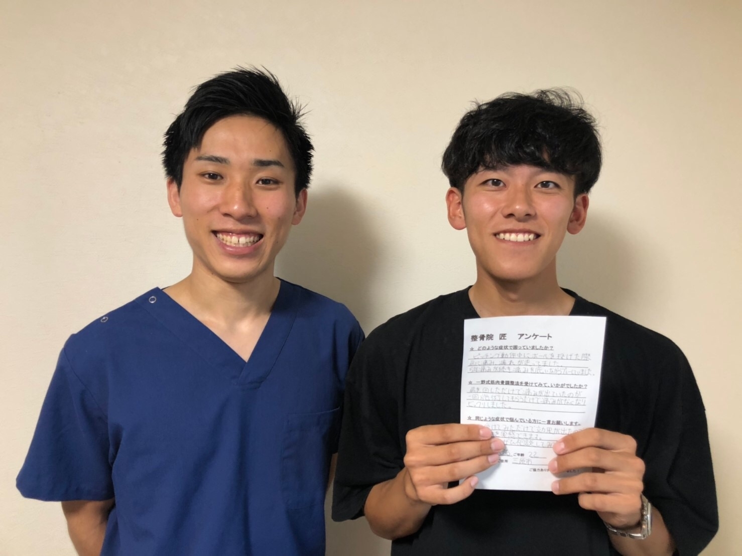 半信半疑で来院させて頂きましたが1回目の施術後に動作確認した時正直笑ってしまう程に首の痛みが軽くなり頭もスッキリして首が回るようになっていたので本当にびっくりで嬉しかったです。