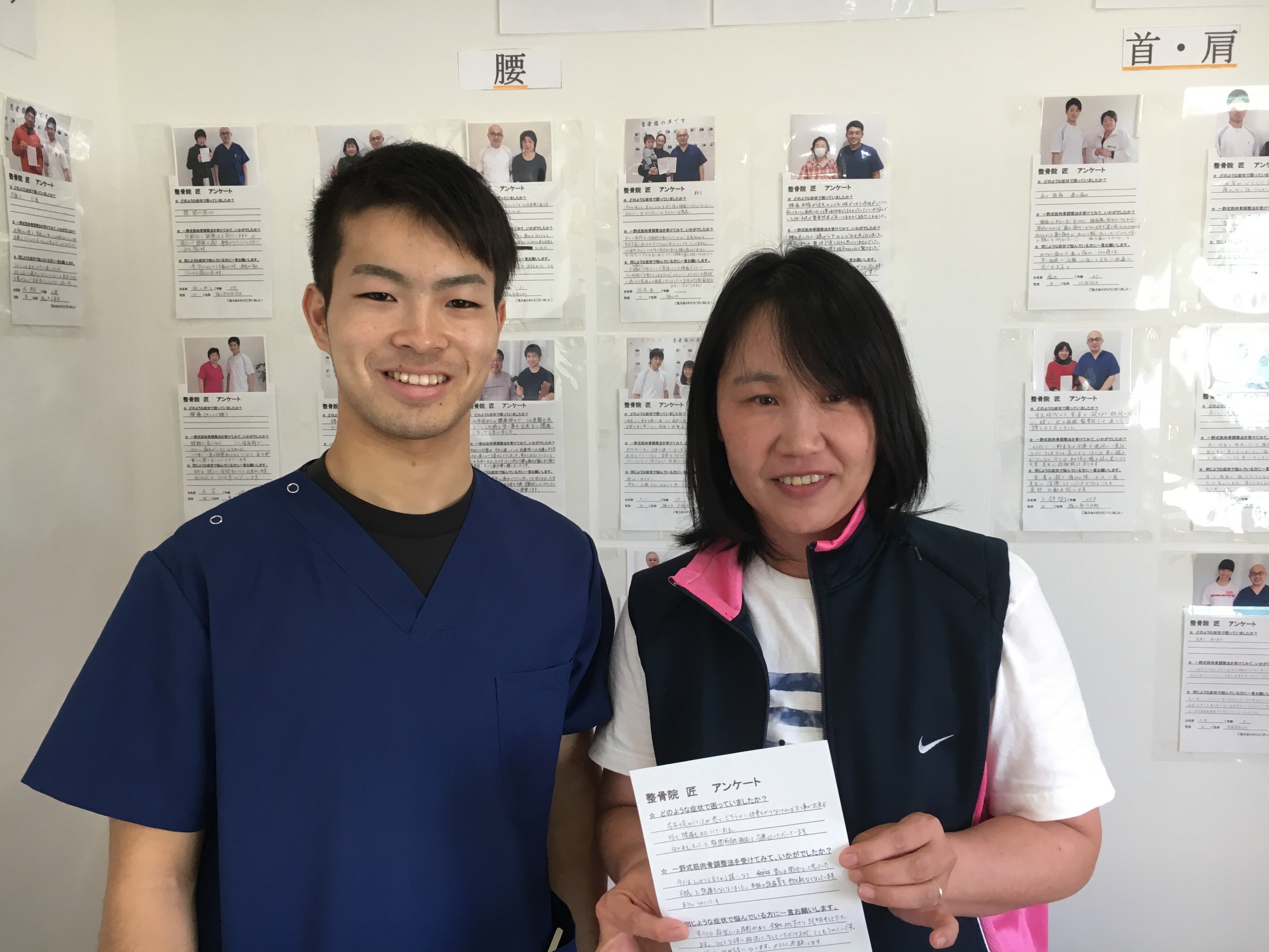 以前から肩こり、腰痛、O脚、体のしんどさなどで悩んでいたのですが、昨年の4月に階段から落ちて腰を痛めてしまい他の接骨院に通っていましたが、なかなか良くならず辛い状態でした。 施術を受ける度に、腰の痛みが軽くなったり体が楽になってきたのを実感することが出来ます。 私と同じような症状で悩んでいらっしゃる方は諦めたりしないで1度相談してみることをおすすめします。 (池田 暁美さん) ※効果には個人差があります |